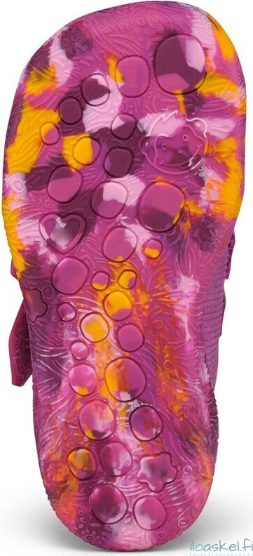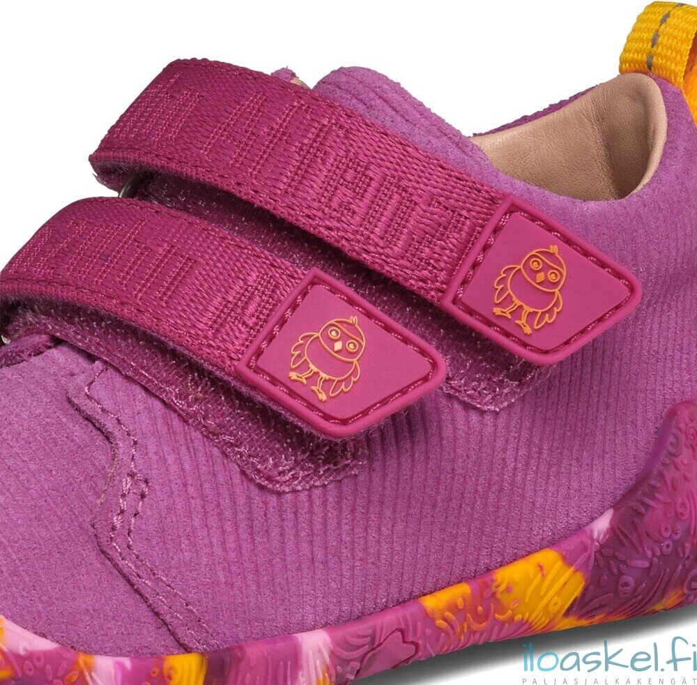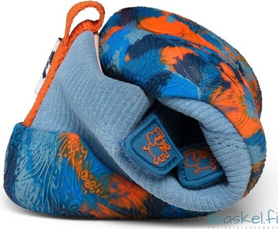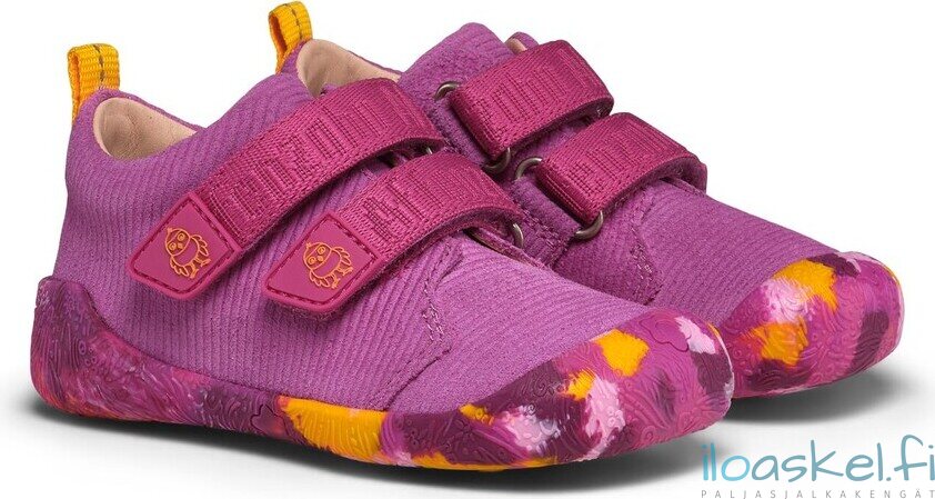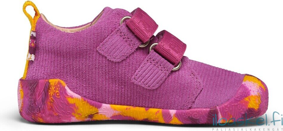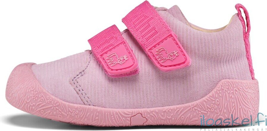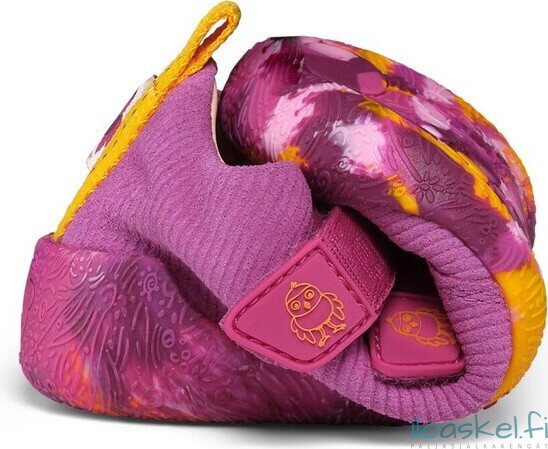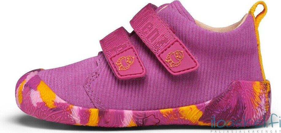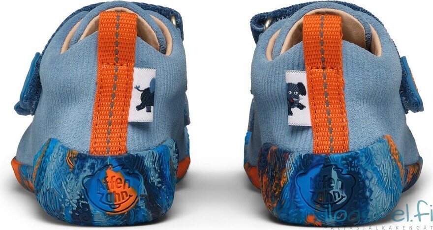 Kengissä on takana eläinaiheiset kangasmerkit, joidenavulla lapsen on helppo pukea kengät oikeisiin jalkoihin.
