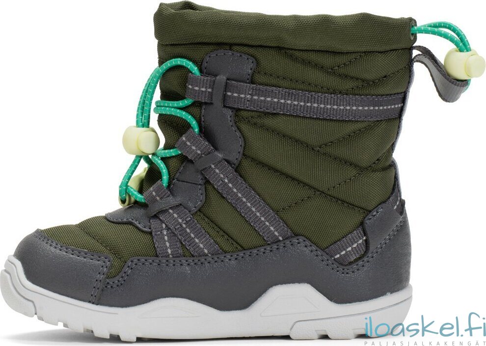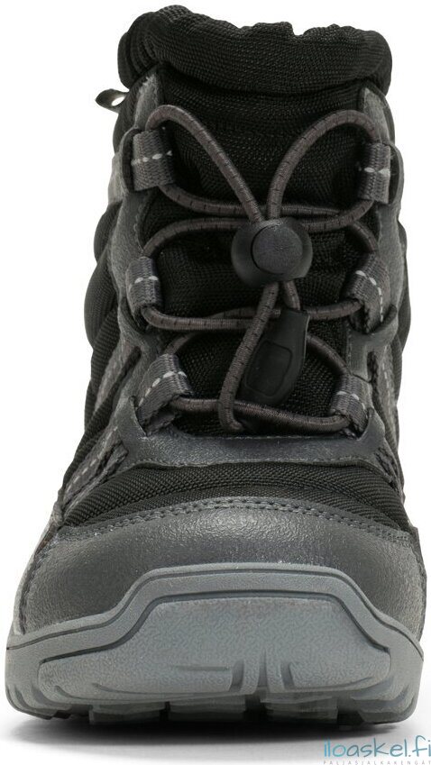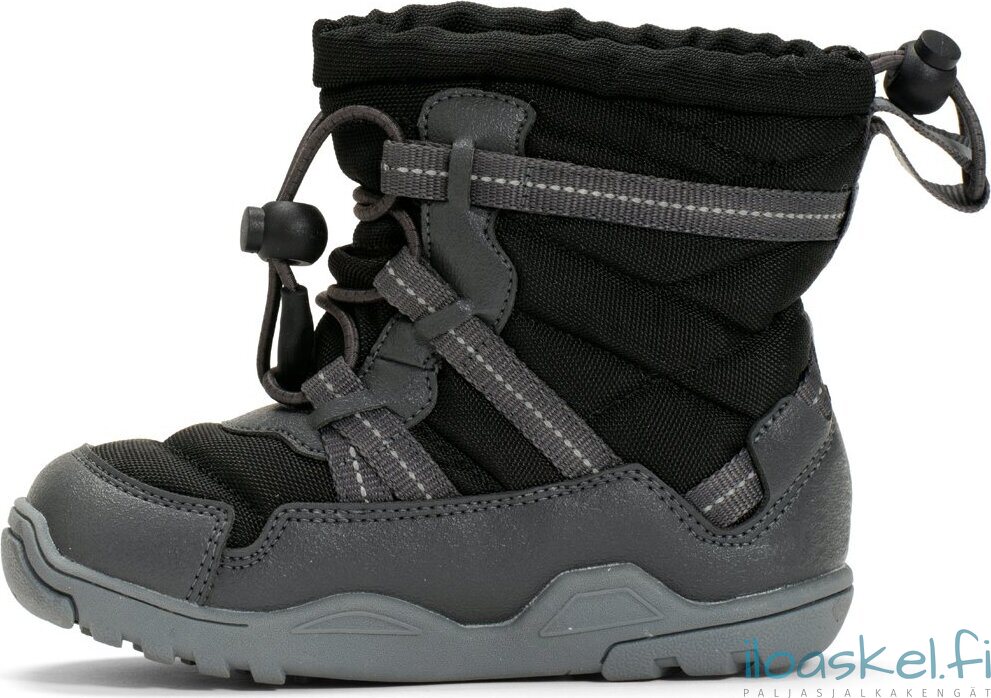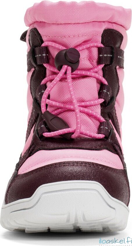 Nämä kengät on lapsen helppo itse vetää jalkaan, ja pikalukollisilla joustonauhoilla kengät saa kiristeltyä jalkaan istuviksi. Myös varren yläosassa on kiristysnauha, jotta lunta ei mene varresta sisään.