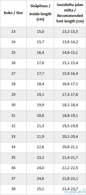 Tämä malli sopii parhaiten kapeahkoon, normaaliin tai maksimissaan leveähköön jalkaan, joka ei ole kovin korkea jalkapöydän kohdalta.