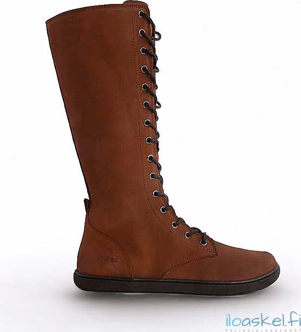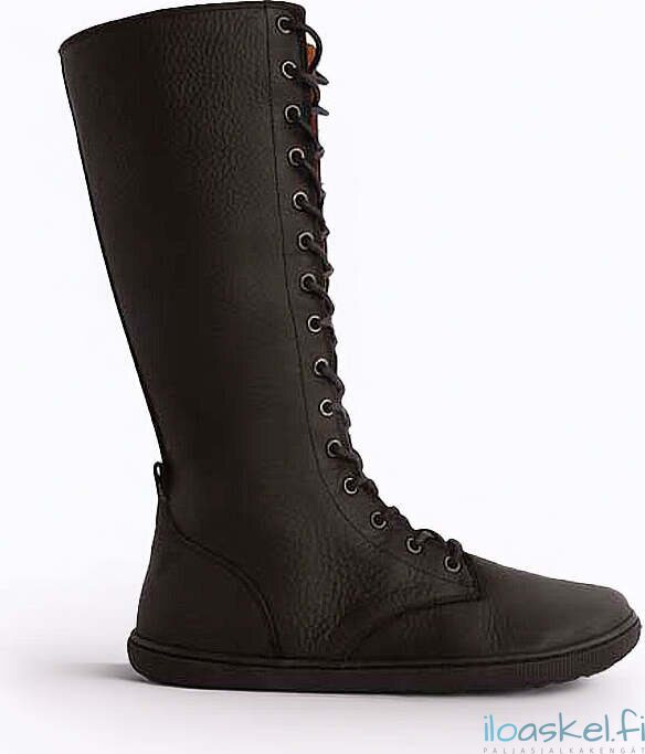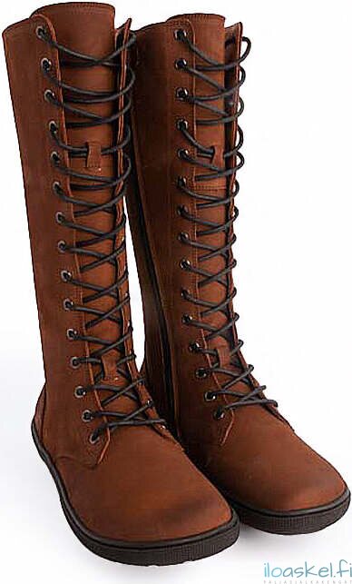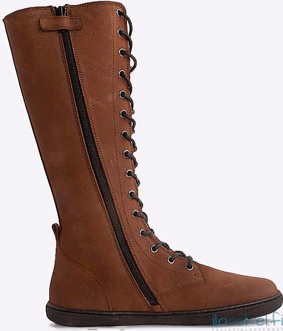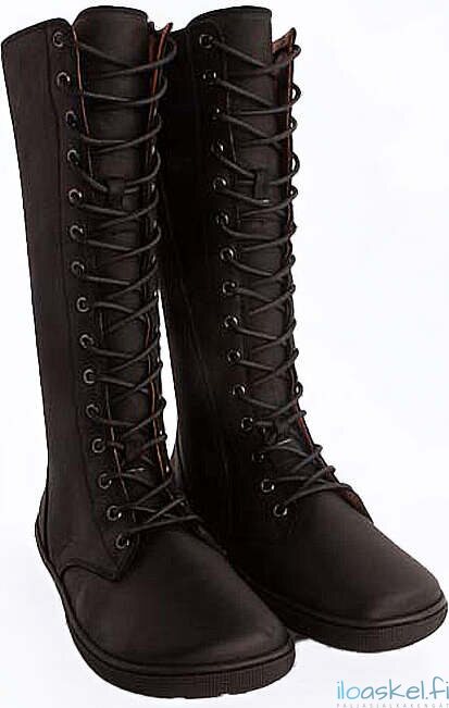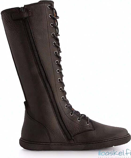 Korkeavartinen nahkasaapas nauhoilla ja vetoketjulla. Nauhoituksella saa kivasti säädettyä istuvuutta ja varren leveyttä.