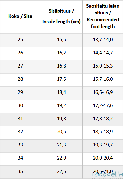 Nämä kengät ovat paksun vuorin takia melko pientä mitoitusta. Mittaa lapsen jalat, ja lisää pidemmän jalan mittaan noin 1,5-1,8/2 cm käyntivaraa, ja valitse sitä lähinnä oleva koko. Kokotaulukon mitat on mitattu kenkämitalla.