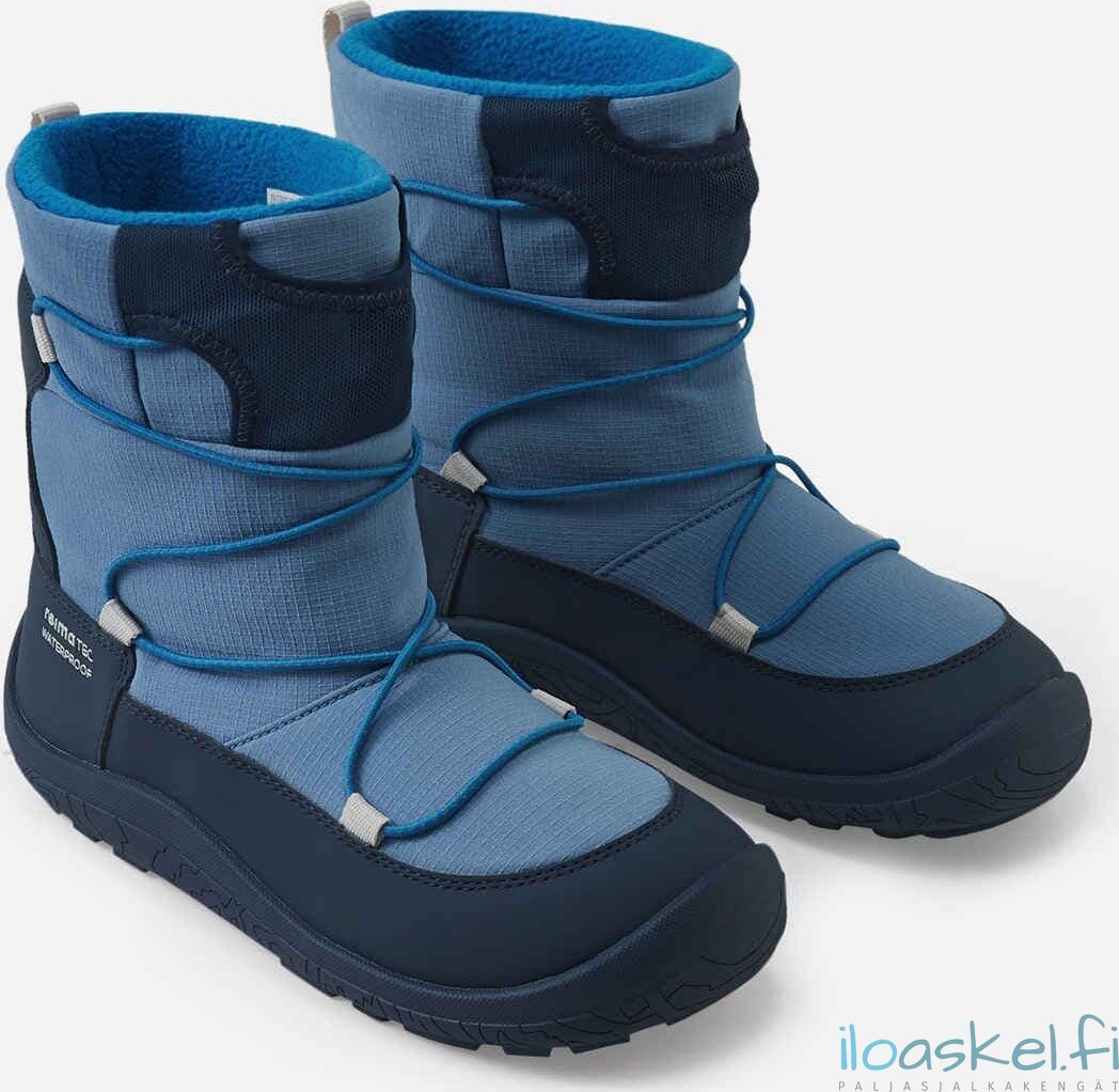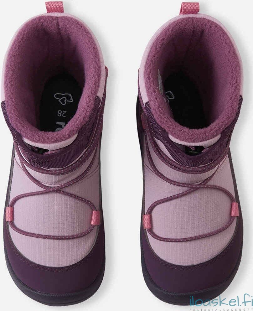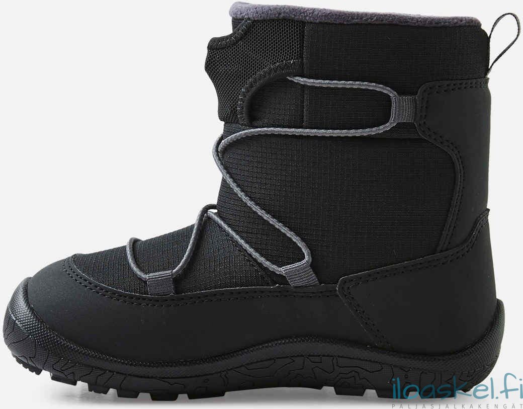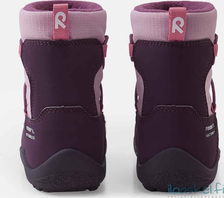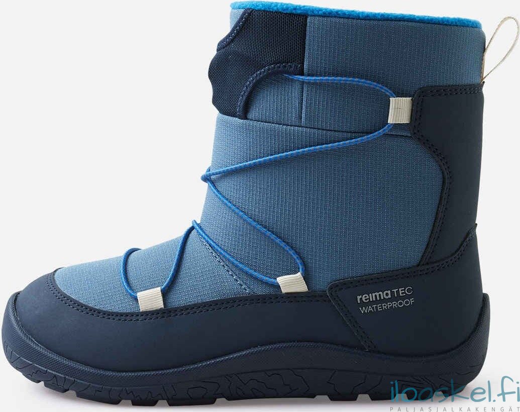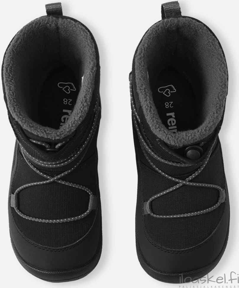Lämpimät ja hyvin säänkestävät ReimaTec-talvisaappaat, joissa paljasjalkalesti ja lämmin vuori. Taipuisa pohja antaa hyvän pidon.