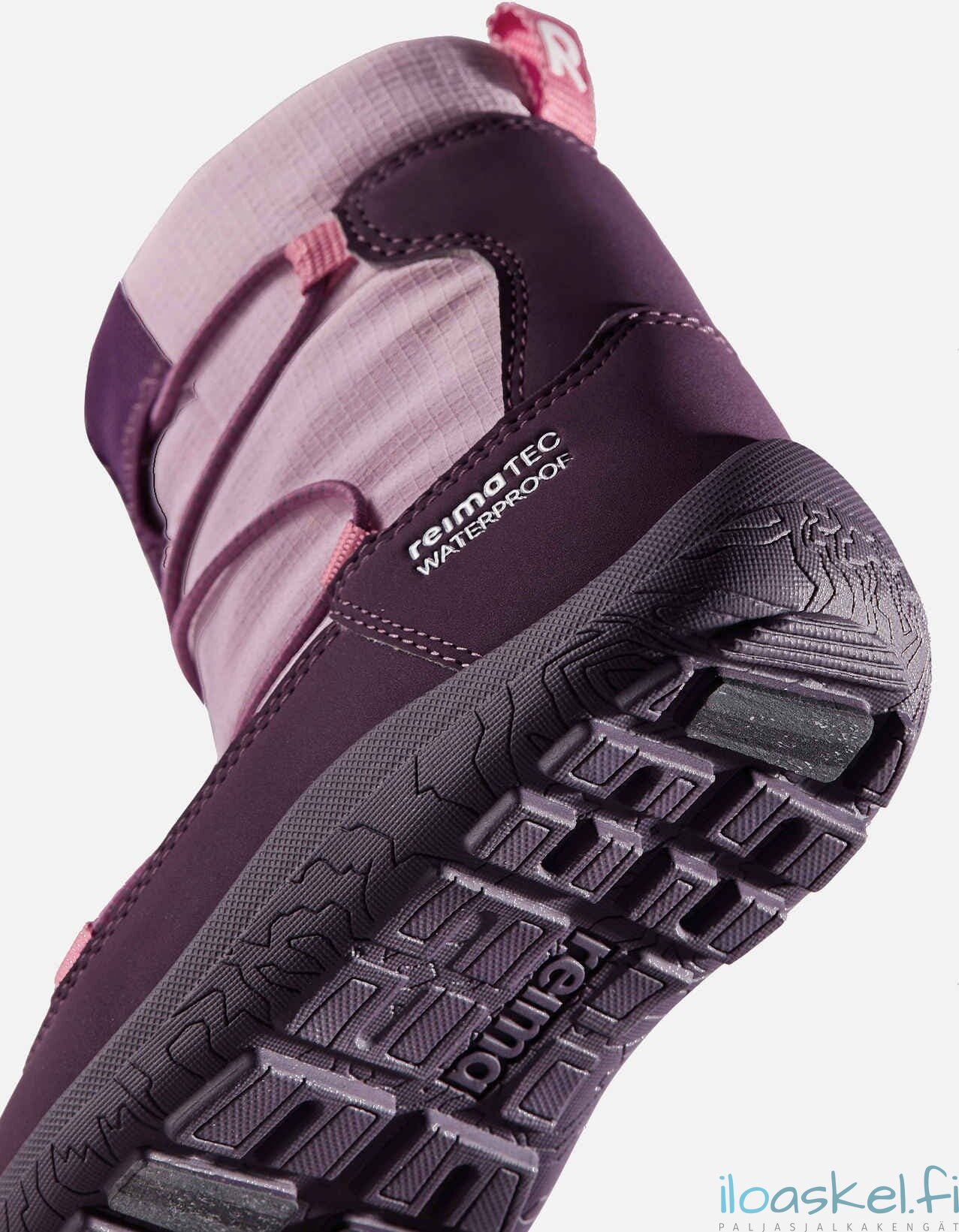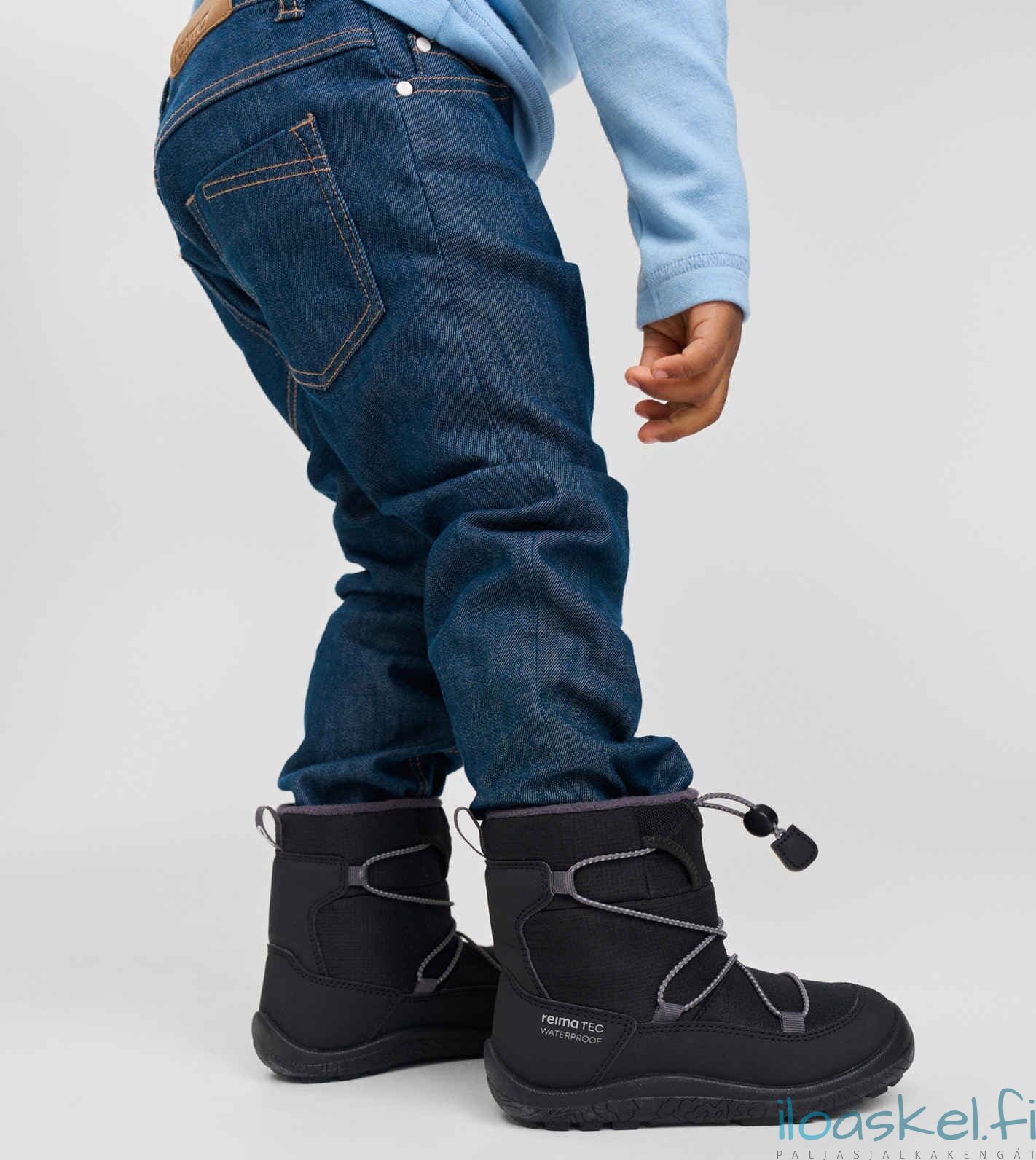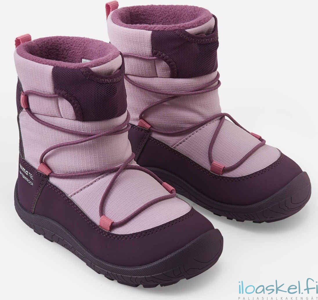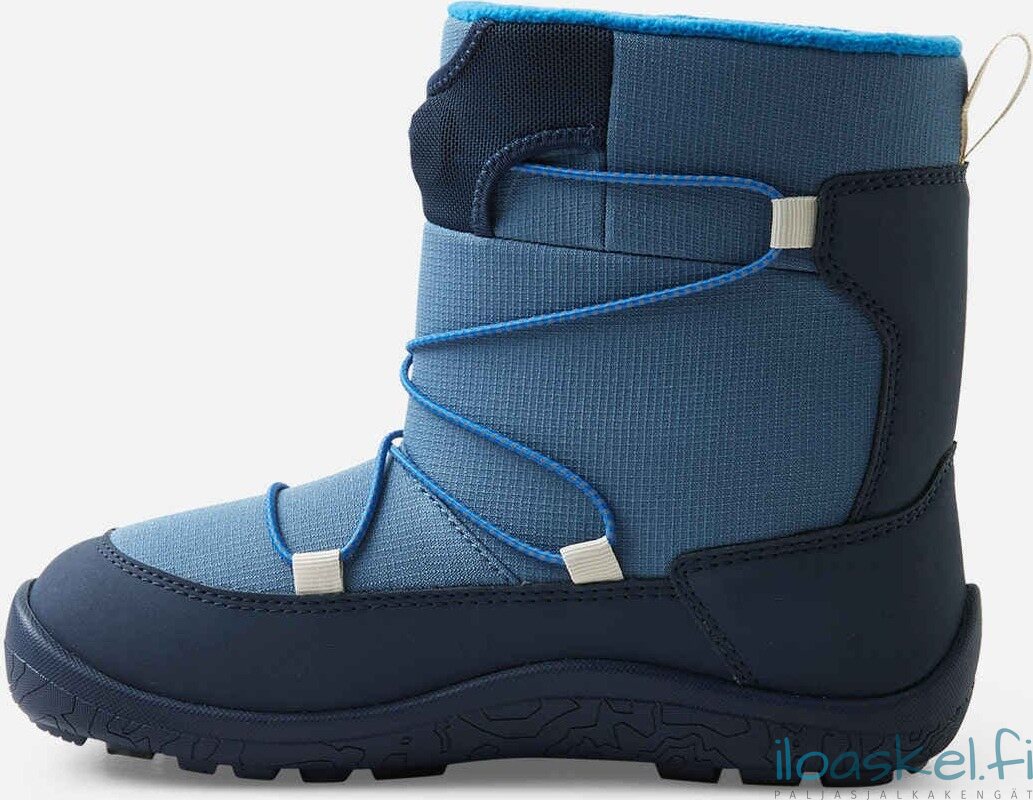 Lämpimät ja hyvin säänkestävät ReimaTec-talvisaappaat, joissa paljasjalkalesti ja lämmin vuori. Taipuisa pohja antaa hyvän pidon.