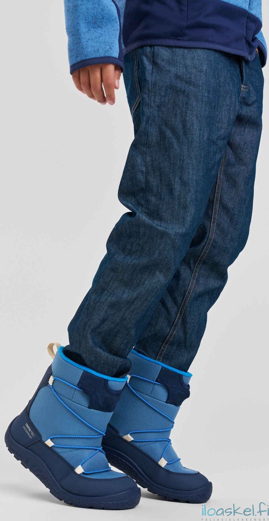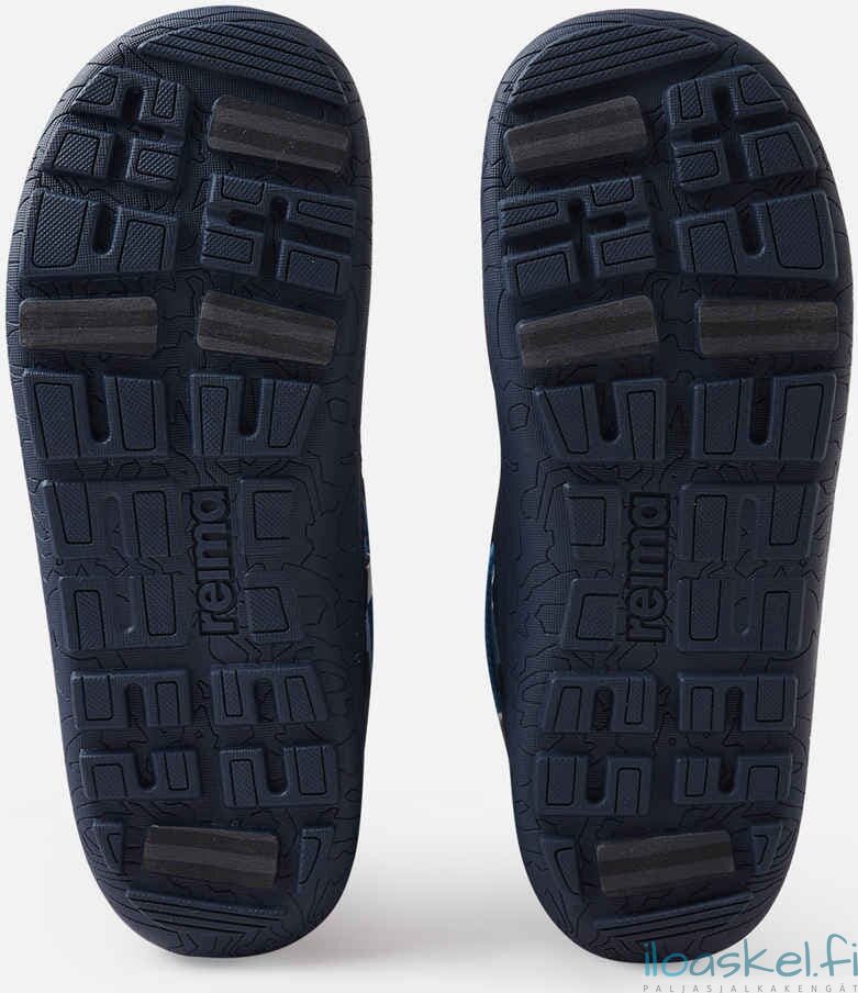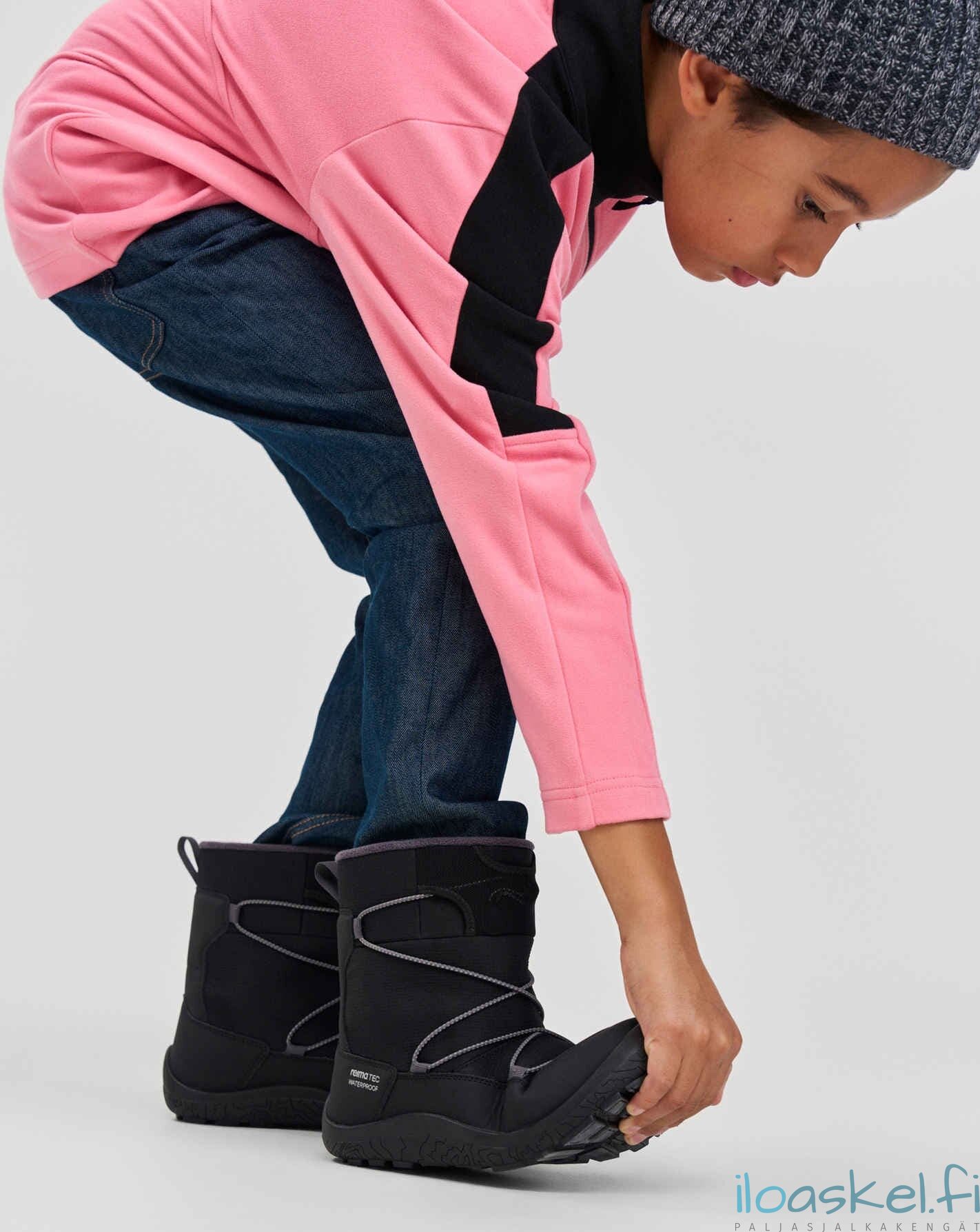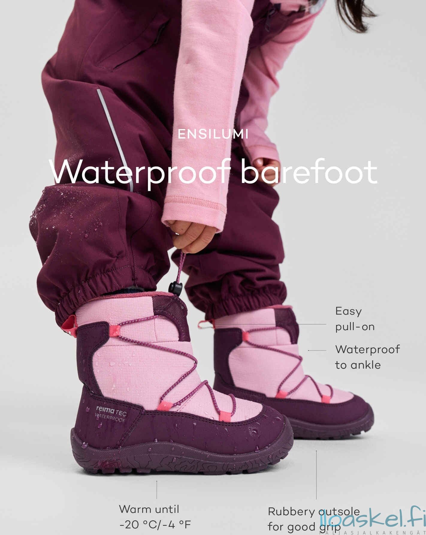 Lämpimät ja hyvin säänkestävät ReimaTec-talvisaappaat, joissa paljasjalkalesti ja lämmin vuori. Taipuisa pohja antaa hyvän pidon.