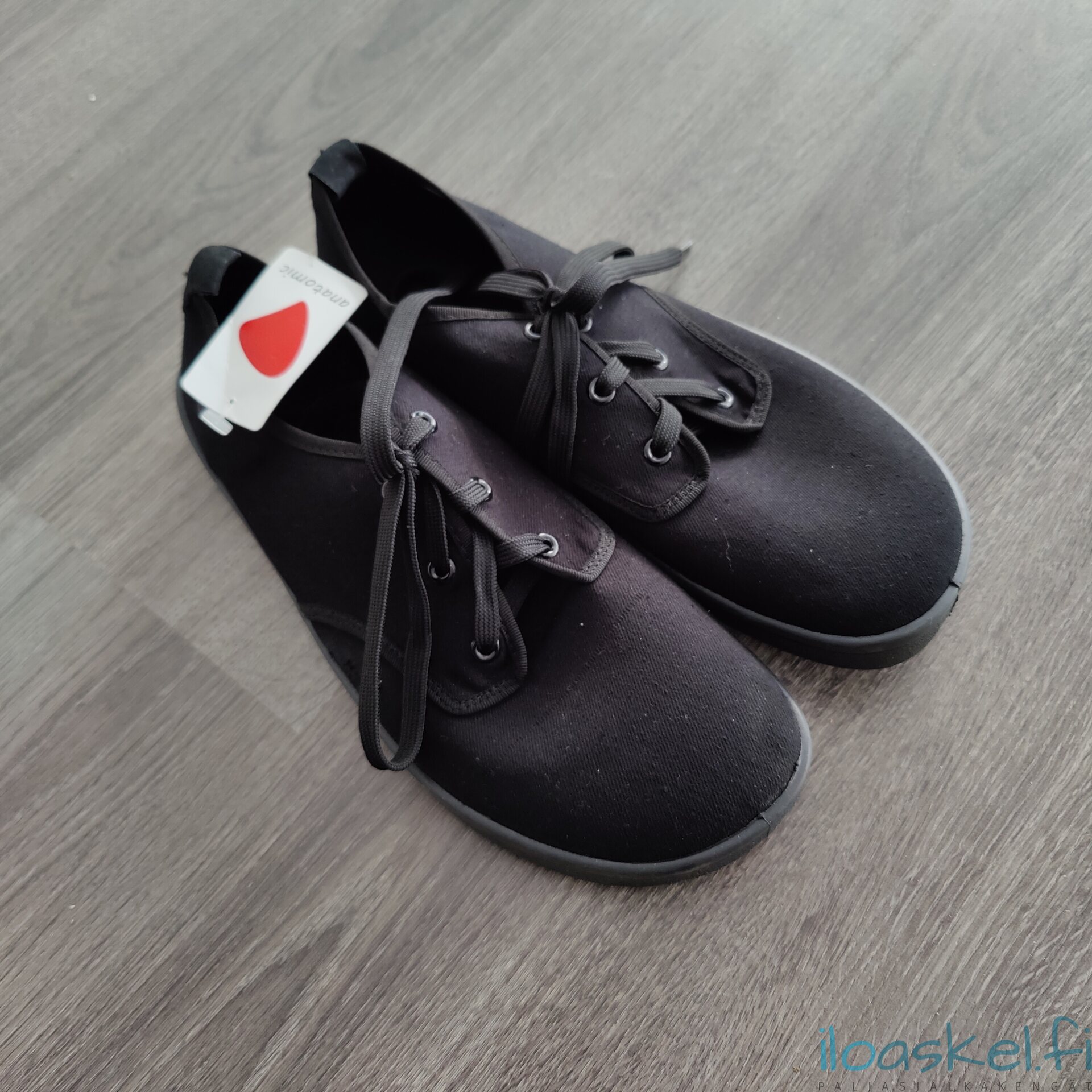Uudet, käyttämättömät, mustat canvas-tennarit kokoa 44 (sisäpituus 28,5 cm). Oikean kengän sivussa hieman rispaumaa / kulumaa.