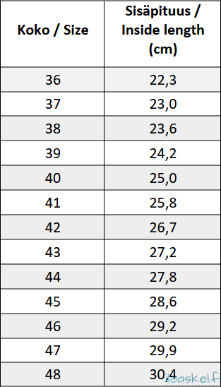 Huom. Mitoitus pitäisi olla suunnilleen sama kuin Leguanon muissa talvikengissä, mutta kokotaulukko saattaa päivittyä hiukan, kun olemme tarkistusmitaneet kengät.
