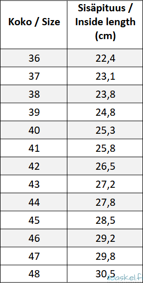 Mittaa jalkateriesi pituus kantapää kevyesti seinää vasten, lisää käyntivaraa n. 1-1,5 cm pidemmän jalkaterän pituuteen, ja valitse tätä mittaa lähinnä oleva koko kokotaulukosta. Tämä malli on melko pientä mitoitusta. Esim. koko 39 sopii noin 23,5 cm pituiseen jalkaan.