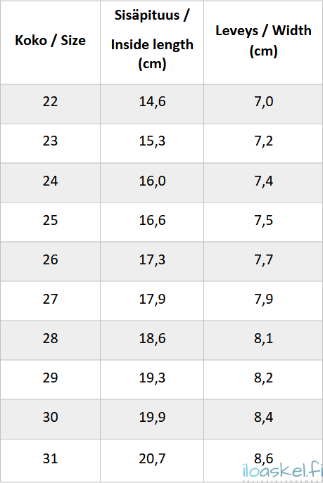 Sopivat normaaliin / leveähköön / leveään jalkaan ja keskivertoon tai korkeaan jalkapöytään.